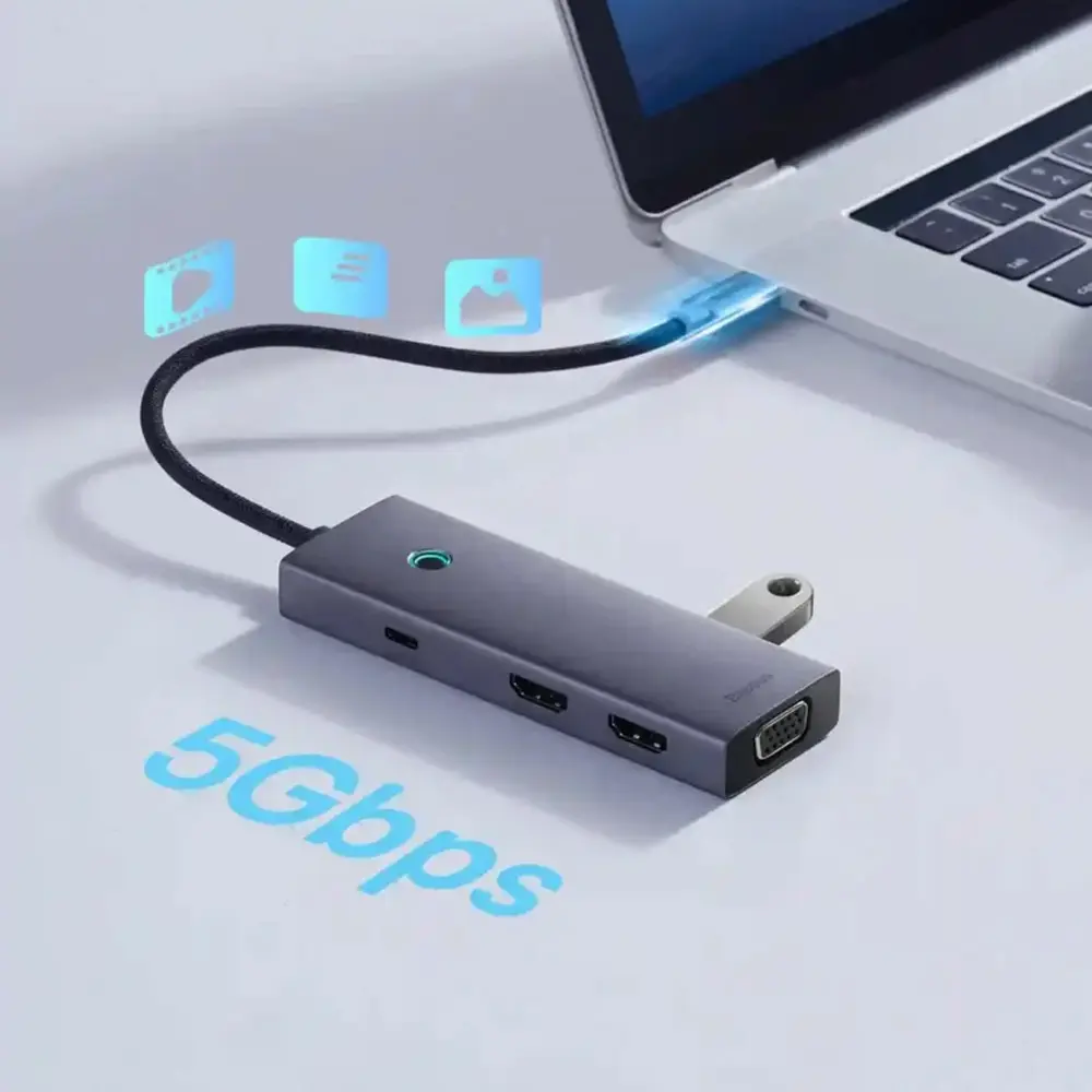 با پشتیبانی از HDMI 1 و HDMI 2 با کیفیت 4K، این هاب برای کاربرانی که نیاز به انتقال تصویر با وضوح بالا دارند، مناسب است. پورت HDMI 1 با کیفیت 4K@60Hz برای افرادی که به تماشای فیلمهای 4K یا بازیهای با کیفیت بالا علاقه دارند، یک انتخاب عالی است. پورت HDMI 2 با کیفیت 4K@30Hz نیز برای کارهایی مانند کنفرانسها یا نمایشهای عمومی مناسب است. علاوه بر این، پورت VGA با کیفیت 1080P@60Hz به شما این امکان را میدهد که به دستگاههای قدیمیتر یا نمایشگرهایی که تنها از VGA پشتیبانی میکنند، متصل شوید.