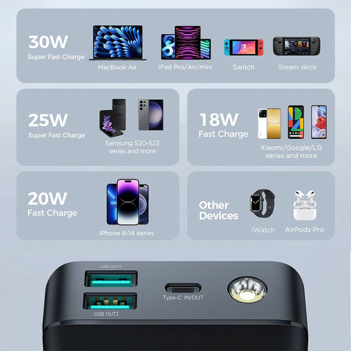 پاوربانک Joyroom JR-PBF02 با توان خروجی 30 وات، به شما این امکان را میدهد که دستگاههای خود را با سرعت بیشتری شارژ کنید. این ویژگی به ویژه برای کاربرانی که به دنبال شارژ سریع هستند، بسیار مهم است. توان 30 وات این پاوربانک باعث میشود که گوشیهای هوشمند، تبلتها و حتی برخی لپتاپها به سرعت شارژ شوند و شما بتوانید به سرعت از دستگاههای خود استفاده کنید. این قابلیت بهخصوص در مواقع اضطراری یا سفرها که به شارژ سریع نیاز دارید، بسیار کارآمد است.