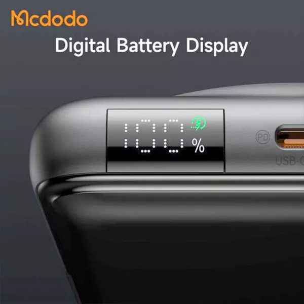 نمایشگر دیجیتال یکی از ویژگیهایی است که در پاوربانکهای حرفهای دیده میشود و Mcdodo MC-6320 نیز از آن بهرهمند است. این صفحه نمایش دیجیتال کوچک و دقیق، میزان شارژ باقیماندهی پاوربانک را بهصورت درصدی نمایش میدهد. با این قابلیت، میتوانید دقیقاً بدانید که چه زمانی باید پاوربانک را شارژ کنید یا اینکه آیا ظرفیت آن برای شارژ دستگاه بعدی کافی هست یا خیر.نمایشگر دیجیتال، جایگزینی بسیار بهتر از چراغهای LED قدیمی است که تنها حدودی از میزان شارژ را نشان میدادند. این ویژگی بهخصوص برای افرادی که مدیریت انرژی برایشان اهمیت دارد، بسیار کاربردی خواهد بود.