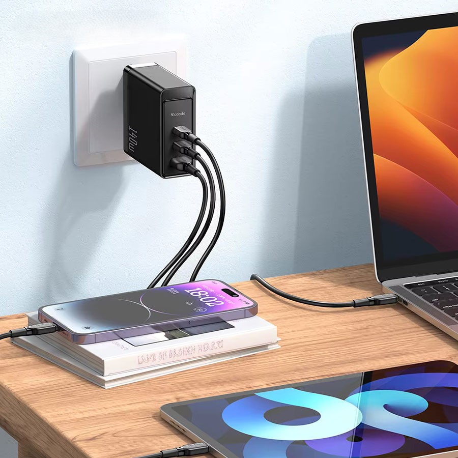 آداپتور شارژ Mcdodo 140W GaN5 Pro دارای 3 پورت است که شامل 1 پورت USB-A و 2 پورت تایپ سی میشود. این ویژگی به شما این امکان را میدهد که همزمان چند دستگاه را با استفاده از تنها یک شارژر شارژ کنید. این پورتها به شما این امکان را میدهند که گوشی، تبلت، لپتاپ، یا حتی دیگر دستگاههای دیجیتال خود را به طور همزمان شارژ کنید.