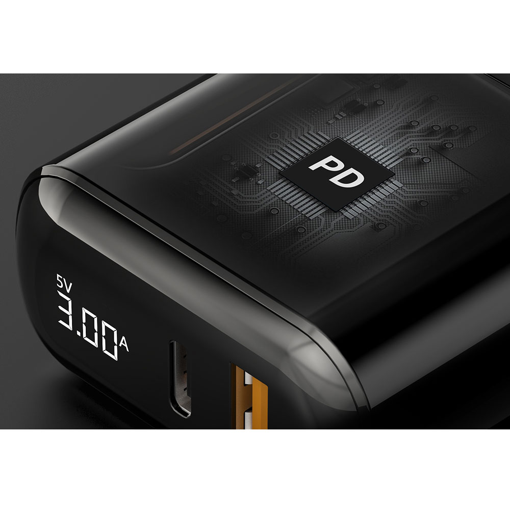 این شارژر دارای دو پورت خروجی USB و Type-C است . هر دوی این پورت ها هم دارای قابلیت های شارژ سریع هستند . ابعاد این محصول 26x51x84.6 میلی متر است