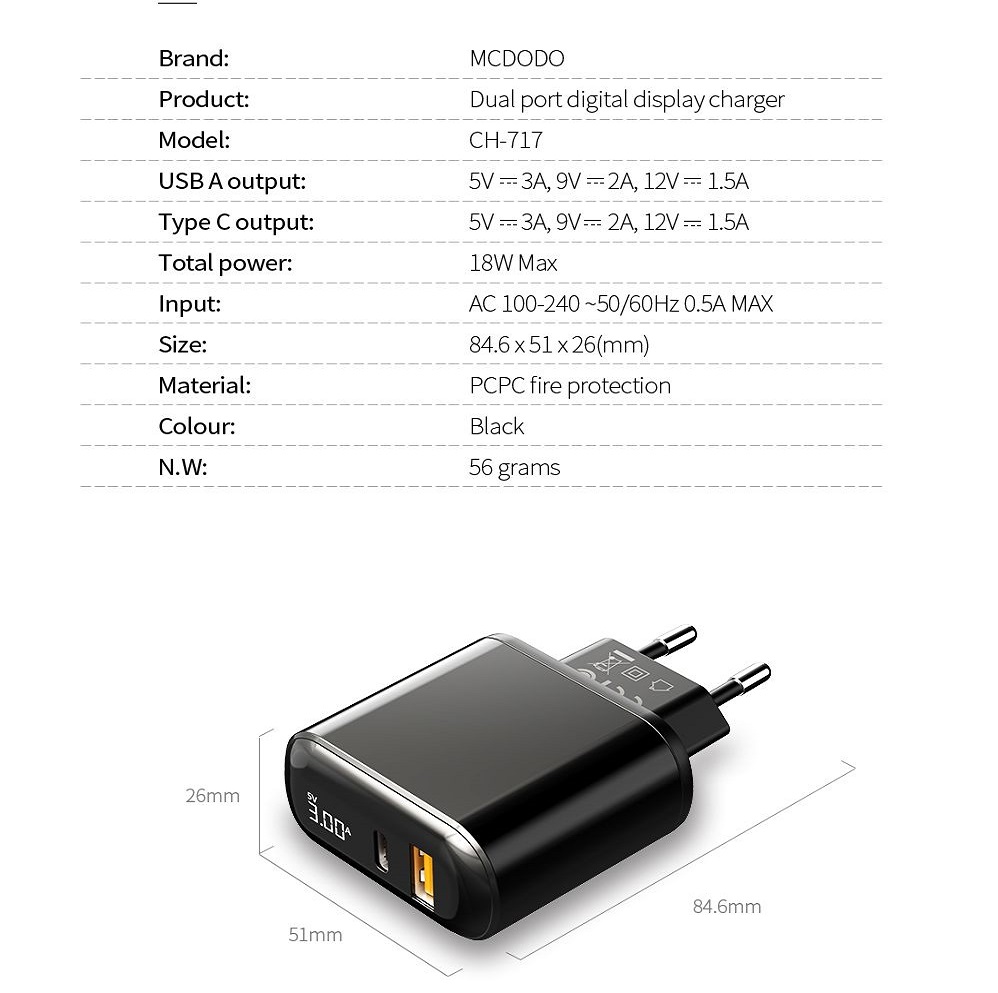 جنس بدنه این شارژر دیواری 2 پورت مک دودو CH-7170 از پلاستیک + ABS و متریال PC است که از مقاومت بسیار بالایی در برابر ضربه و حرارت بر خوردار می باشد .