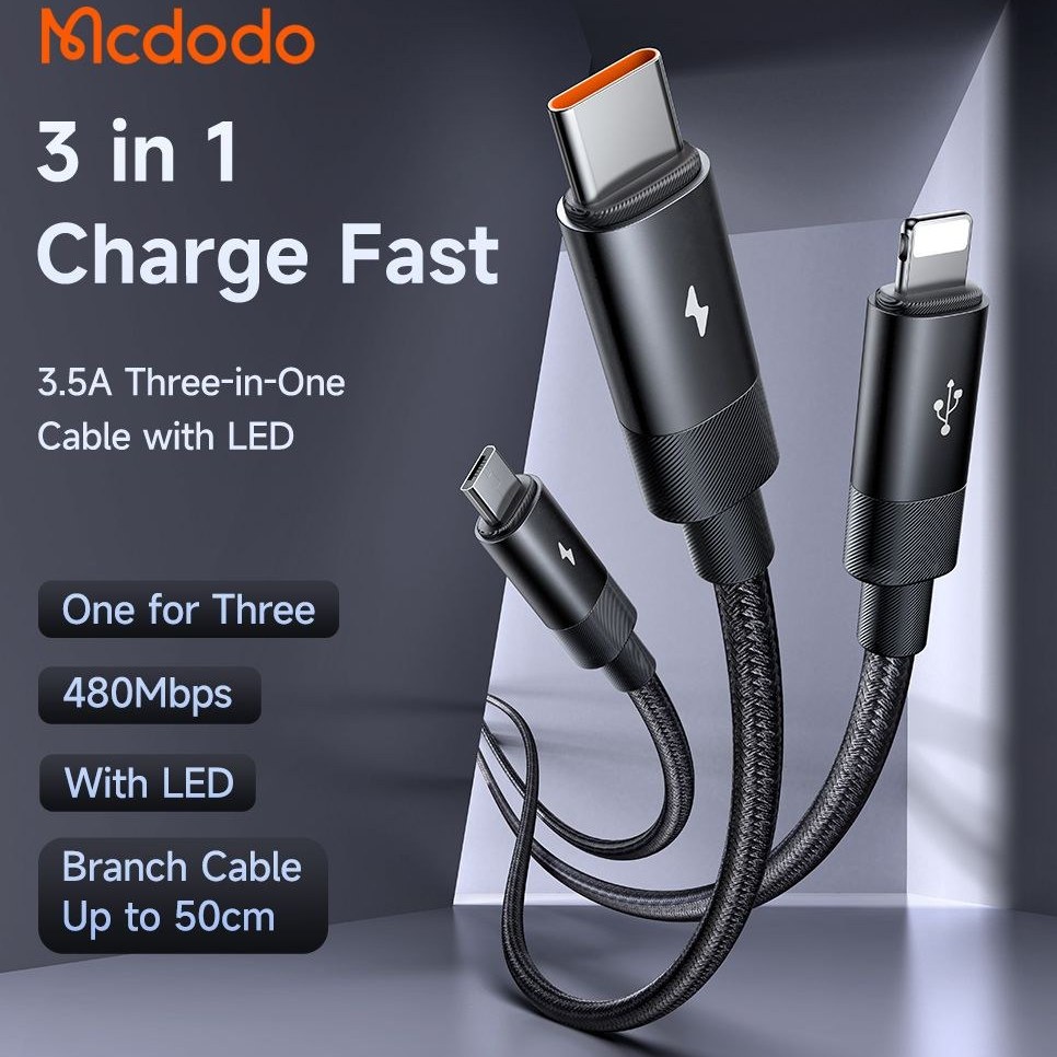 کابل سه سر 1.2 متری مک دودو (Mcdodo 3in1 Multiple Nylon Braided Cable CA-5790) یک کابل چند منظوره است که برای کاربران چندین دستگاه مختلف بسیار مناسب میباشد. این کابل با داشتن سه سر متفاوت (USB-C، میکرو USB، و لایتنینگ) امکان شارژ انواع دستگاههای هوشمند را فراهم میکند.