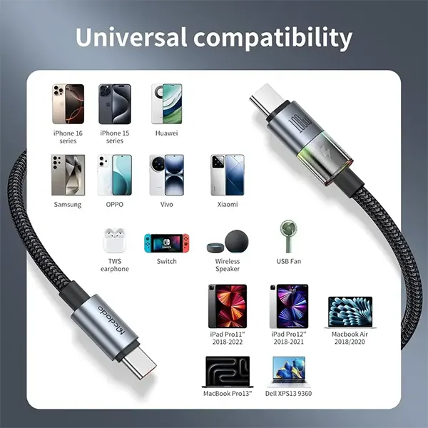 کابل شارژ مک دودو CA-8200 با انواع دستگاههای دارای پورت تایپ سی از جمله آیفون 16/15 سازگار است و بهراحتی به دستگاههای مختلفی که دارید، متصل میشود. این شامل انواع گوشیهای هوشمند، تبلتها، بعضی لپتاپها، دوربینها، کنسولهای بازی و لوازم جانبی است. پس اگر در دستگاهتان چنین پورتی دارید، این محصول برای شما مناسب خواهد بود.