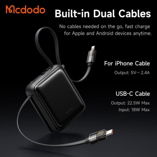 کابلهای داخلی با دو نوع خروجی (Type-C و Lightning) یکی از جذابترین ویژگیهای پاوربانک مک دودو MC-2550، کابلهای داخلی است که دیگر نیازی به حمل کابل جداگانه نیست. این کابلها با دو نوع خروجی Type-C و Lightning، امکان شارژ انواع دستگاههای اندروید و iOS را فراهم میکنند. این طراحی هوشمندانه، راحتی کاربران را به شکل چشمگیری افزایش داده است.
