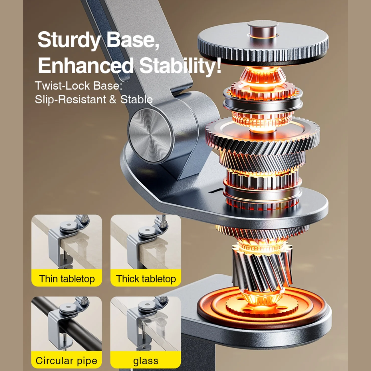 پـایه رتاکو RTAKO T01 دارای یک سیستم چرخشی ویژه با قفل تاب (twist-lock) است که امکان ثابت ماندن و ضد لغزش بودن پایه را تضمین میکند. این ویژگی باعث میشود پایه روی سطوح مختلف، حتی میزهای نازک یا ضخیم، لولههای گرد یا سطوح شیشهای به خوبی پایدار بماند و تکان نخورد.قفل تاب این پایه، علاوه بر افزایش ایمنی نگهداشتن دستگاه، استفاده از آن را روی انواع میزها و فضاها ممکن میسازد. به طور مثال میتوانید از آن روی میز کار، میز مطالعه، میز آشپزخانه، یا حتی روی میلههای گرد صندلی و میزهای خاص استفاده کنید بدون آنکه نگرانی از افتاد ن دستگاه داشته باشید.