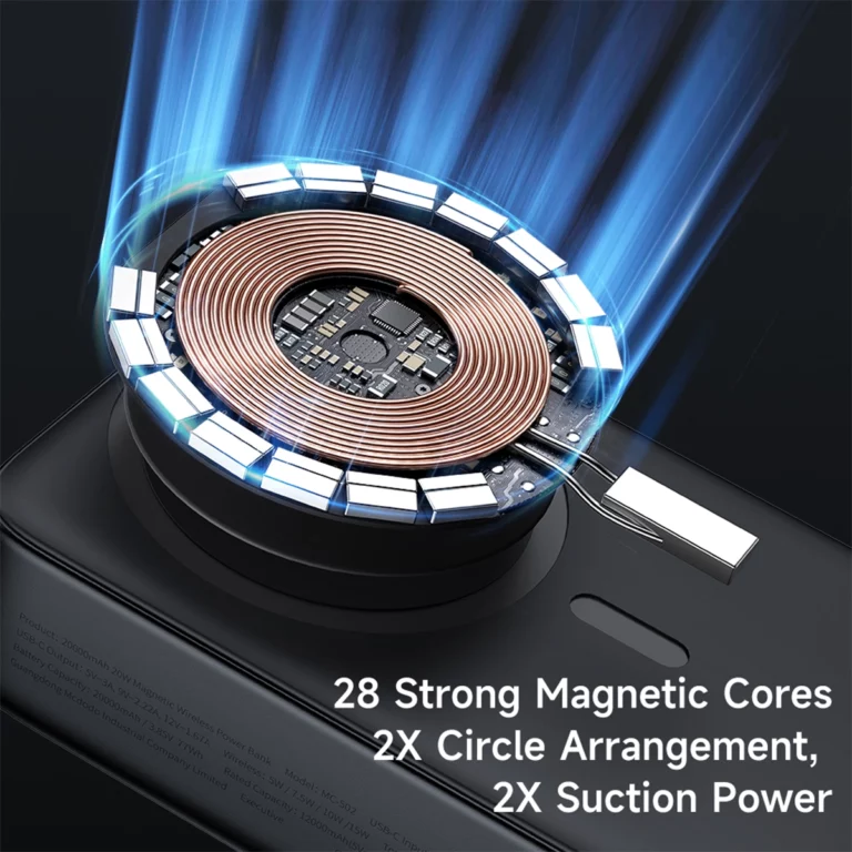 برای شارژ وایرلس، پاوربانک مک دودو مدل MC-5021 به 28 هسته مگنتی مجهز شده که به صورت دایرهای شکل زیر سطح بدنه دستگاه قرار گرفتهاند. این سطح مگنتی میتواند آیفون شما را با نیروی 14 نیوتون به خود جذب کرده و آن را به خوبی سر جایش نگه دارد. این پاوربانک میتواند با توان 5، 7.5، 10 یا حداکثر 15 وات دستگاهی که رویش قرار دارد را شارژ کند.